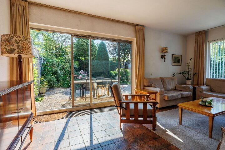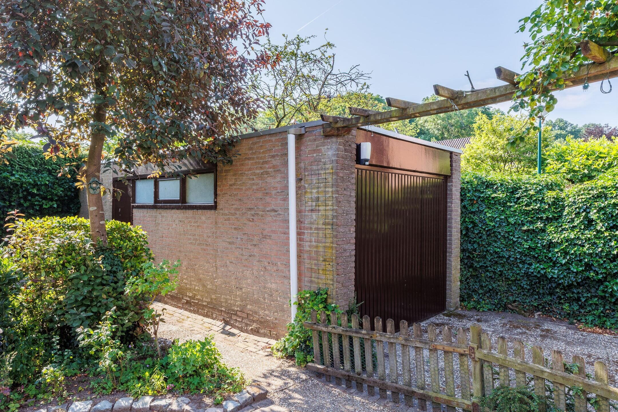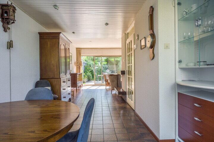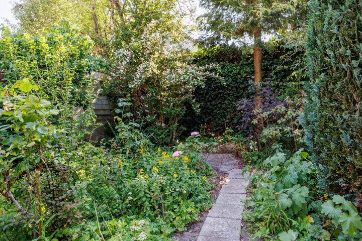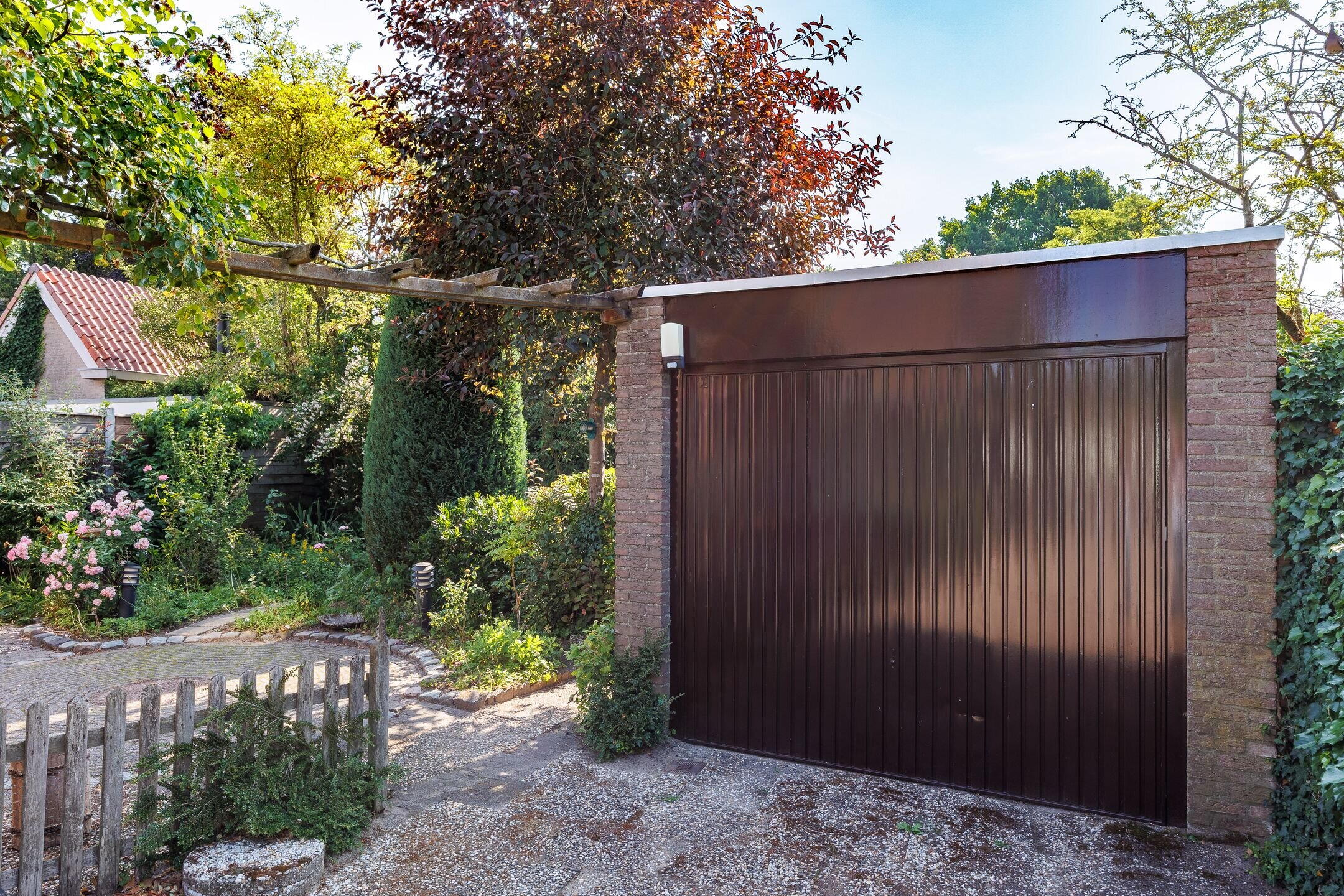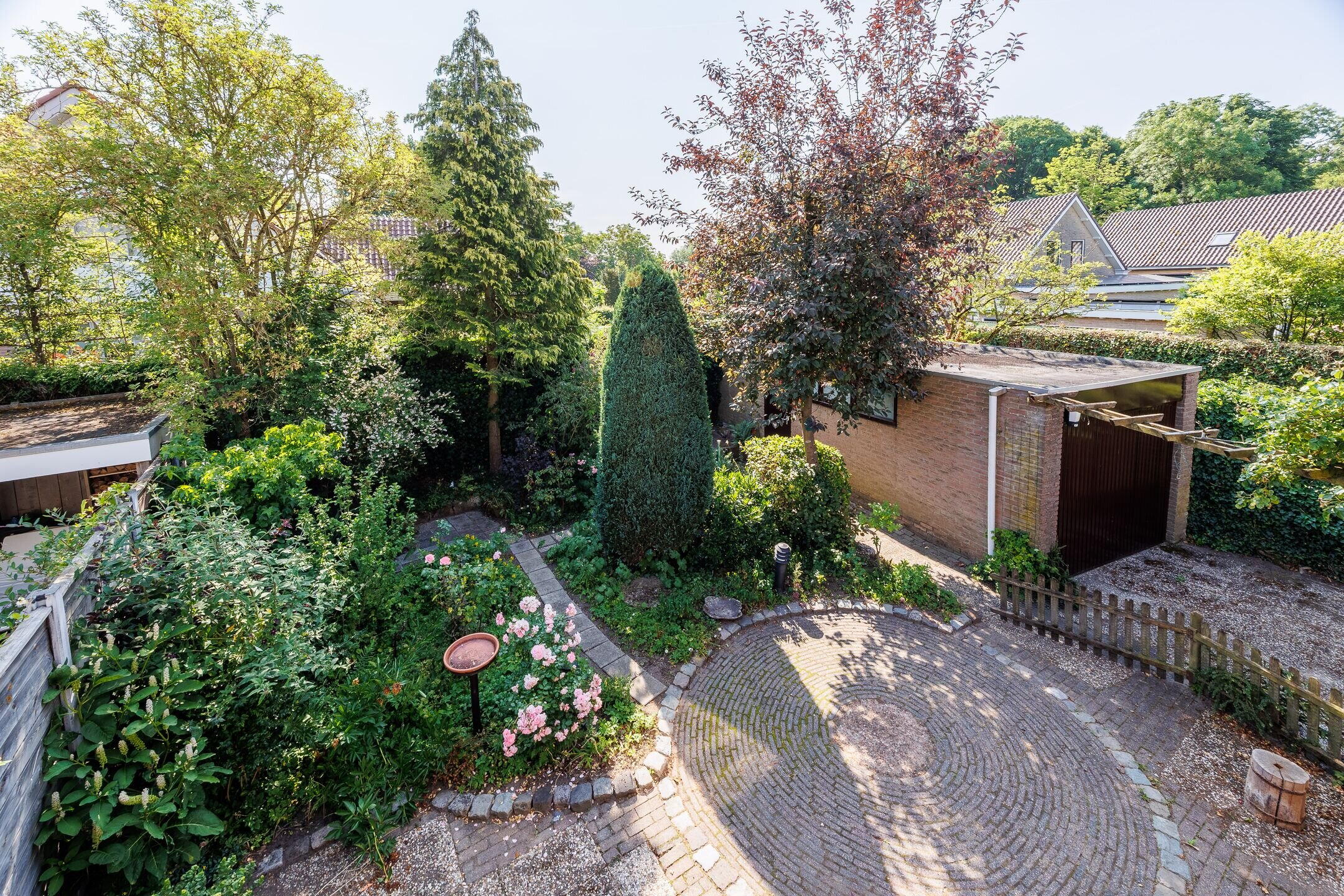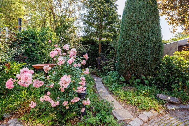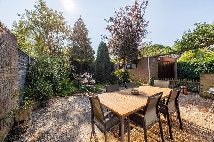 De achtertuin biedt veel privacy door de volgroeide bomen aan de achterzijde en is ingericht met meerdere beschutte zitjes. Dankzij de gunstige indeling zijn er zowel zonnige als schaduwrijke plekjes te vinden. De lange oprit naast de woning leidt naar een ruime garage met plek voor een auto én extra werkruimte, zoals een werkbank.