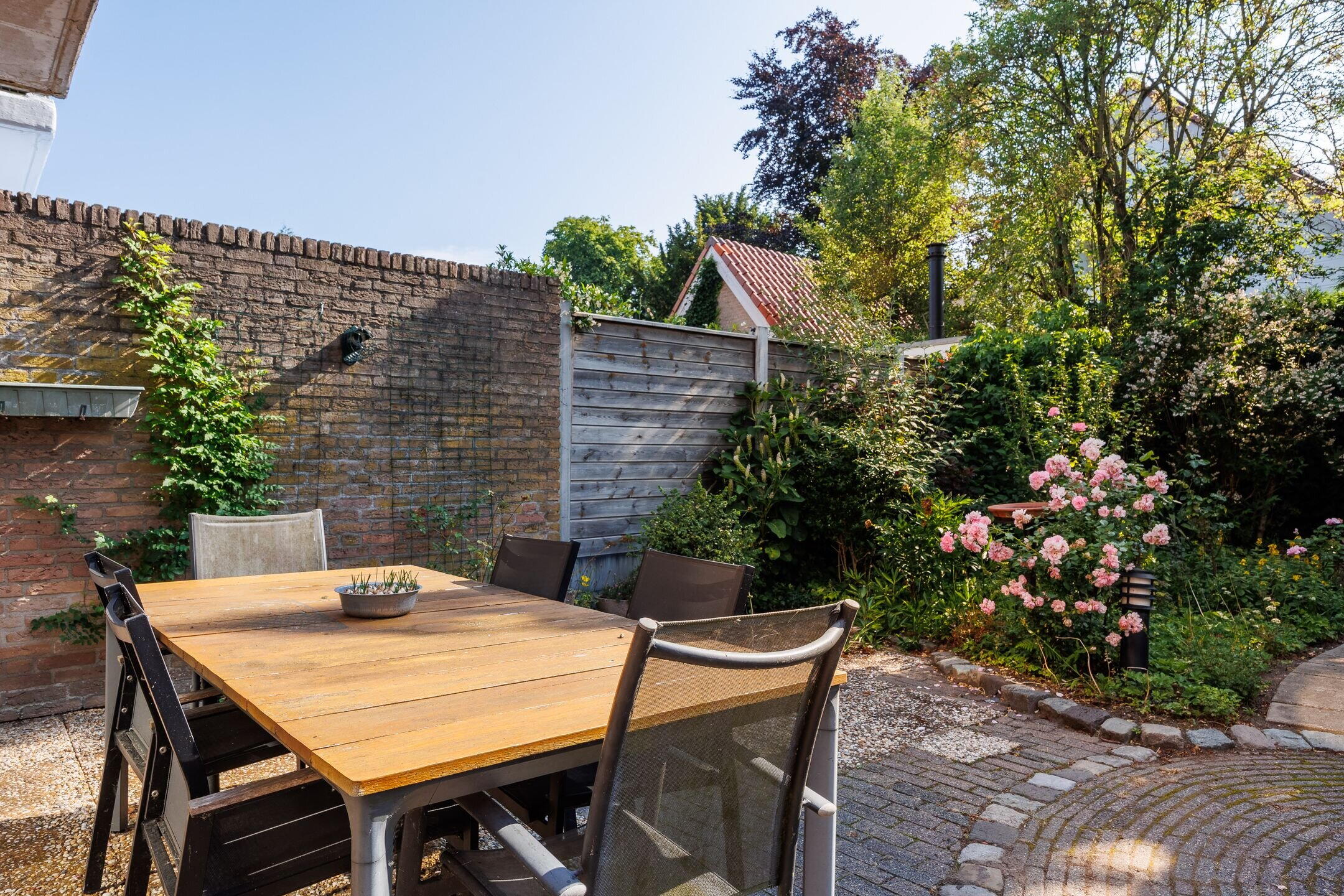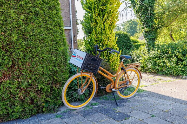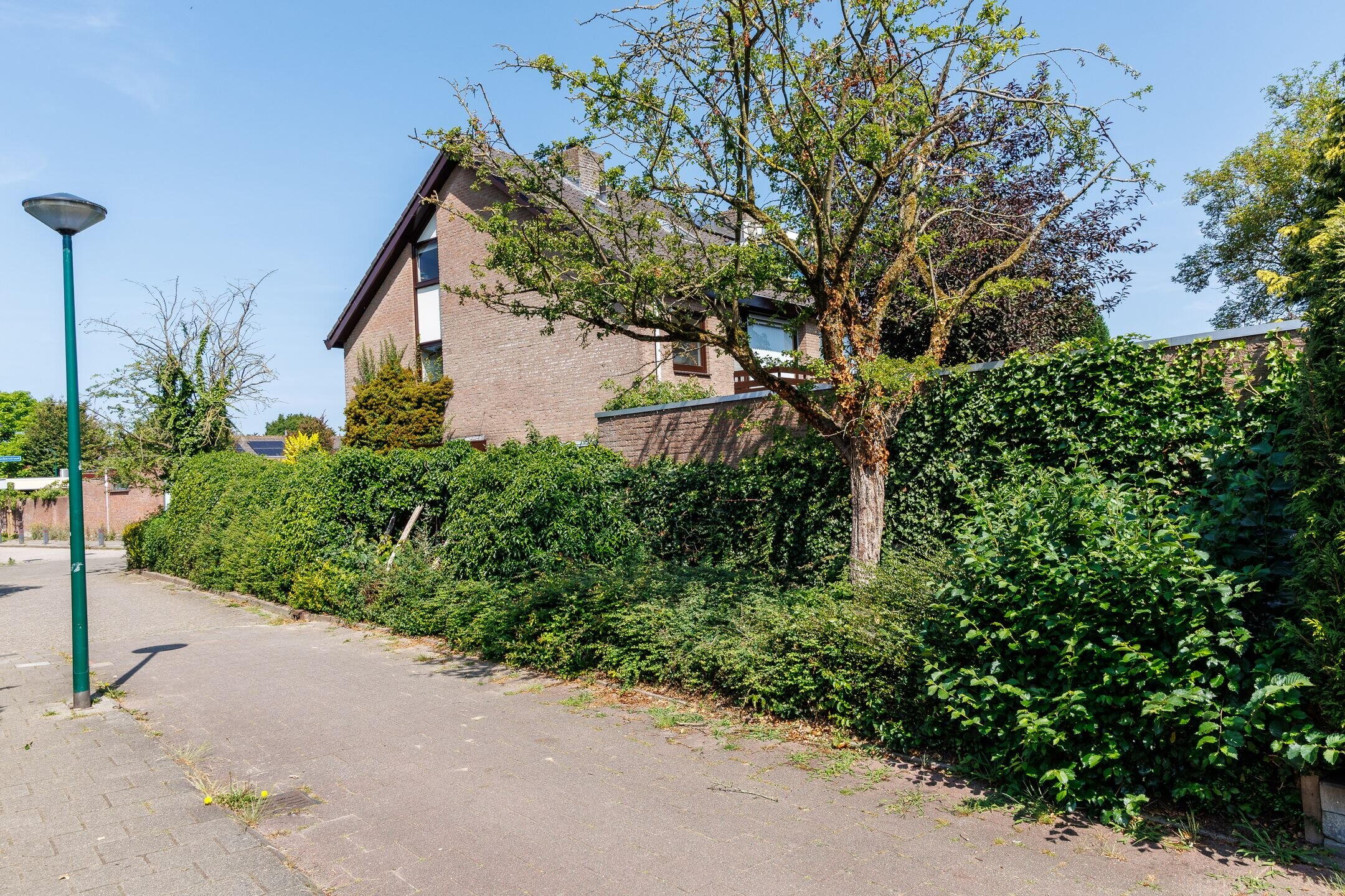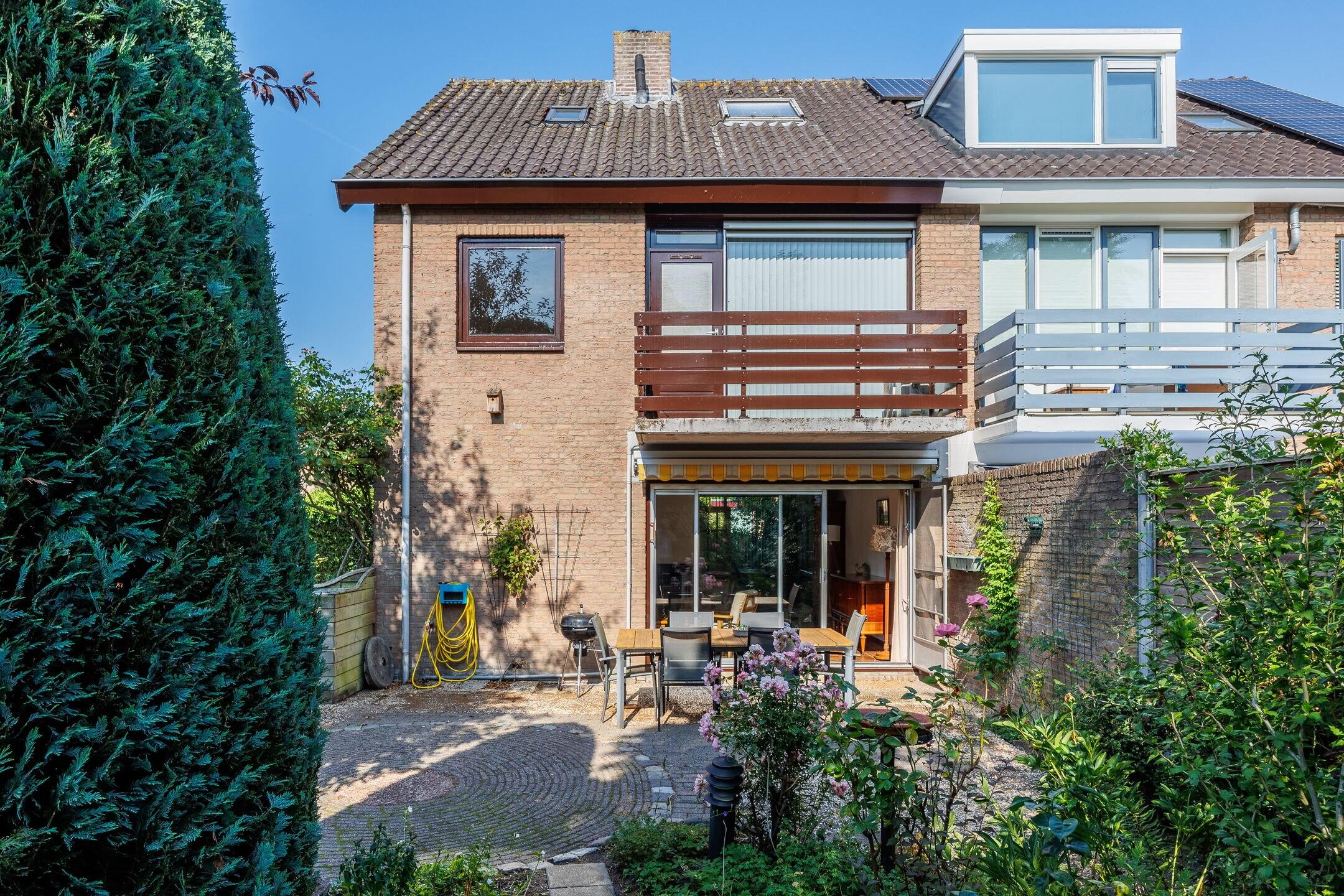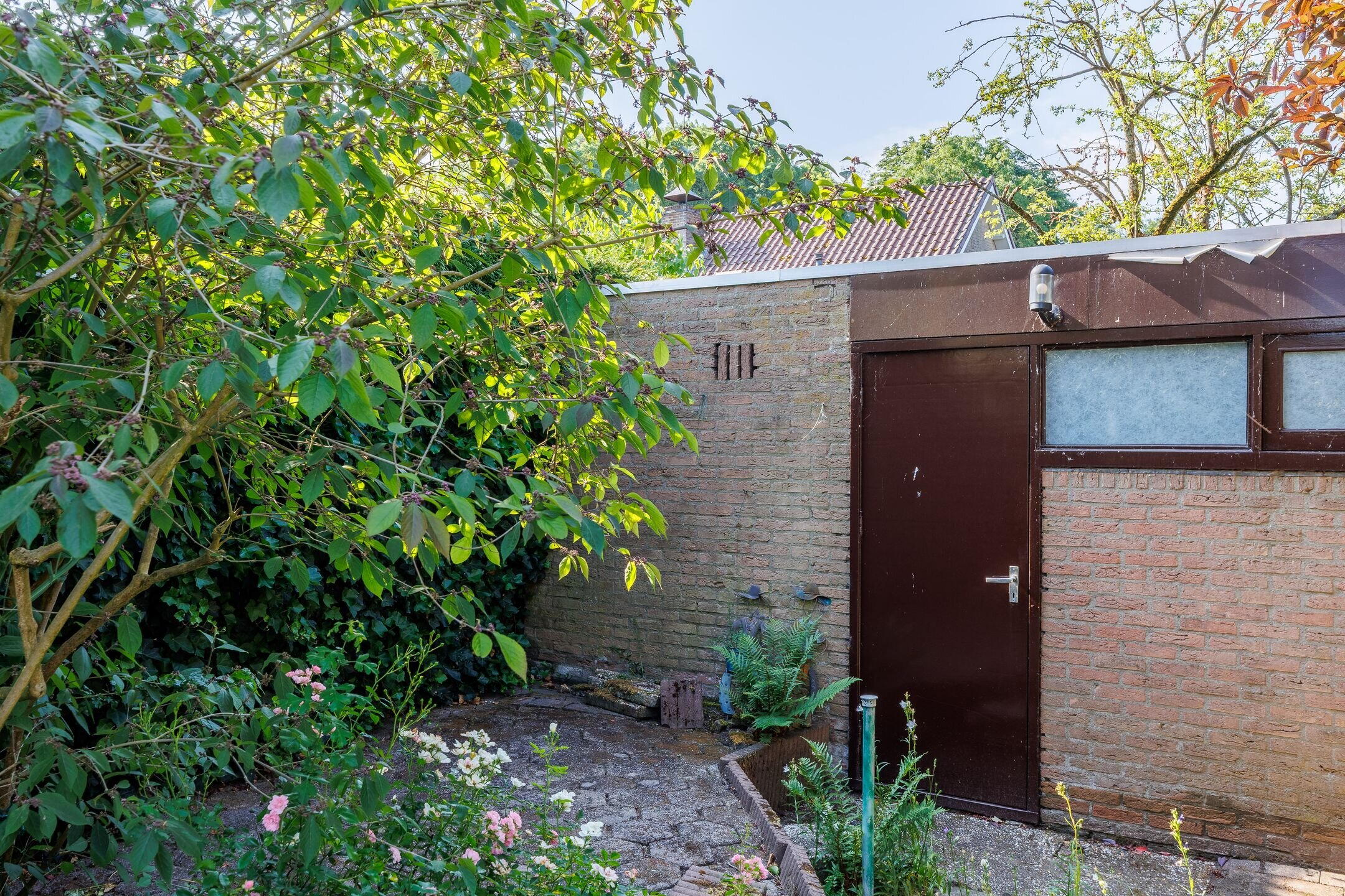 De achtertuin biedt veel privacy door de volgroeide bomen aan de achterzijde en is ingericht met meerdere beschutte zitjes. Dankzij de gunstige indeling zijn er zowel zonnige als schaduwrijke plekjes te vinden. De lange oprit naast de woning leidt naar een ruime garage met plek voor een auto én extra werkruimte, zoals een werkbank.