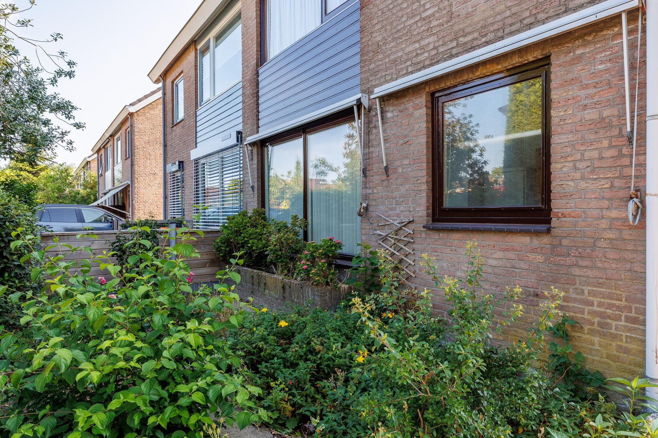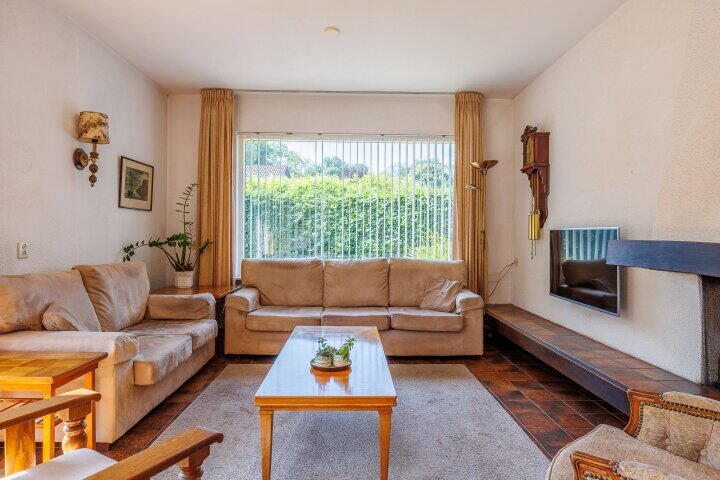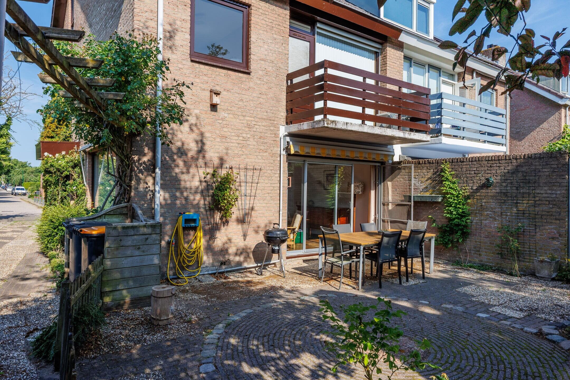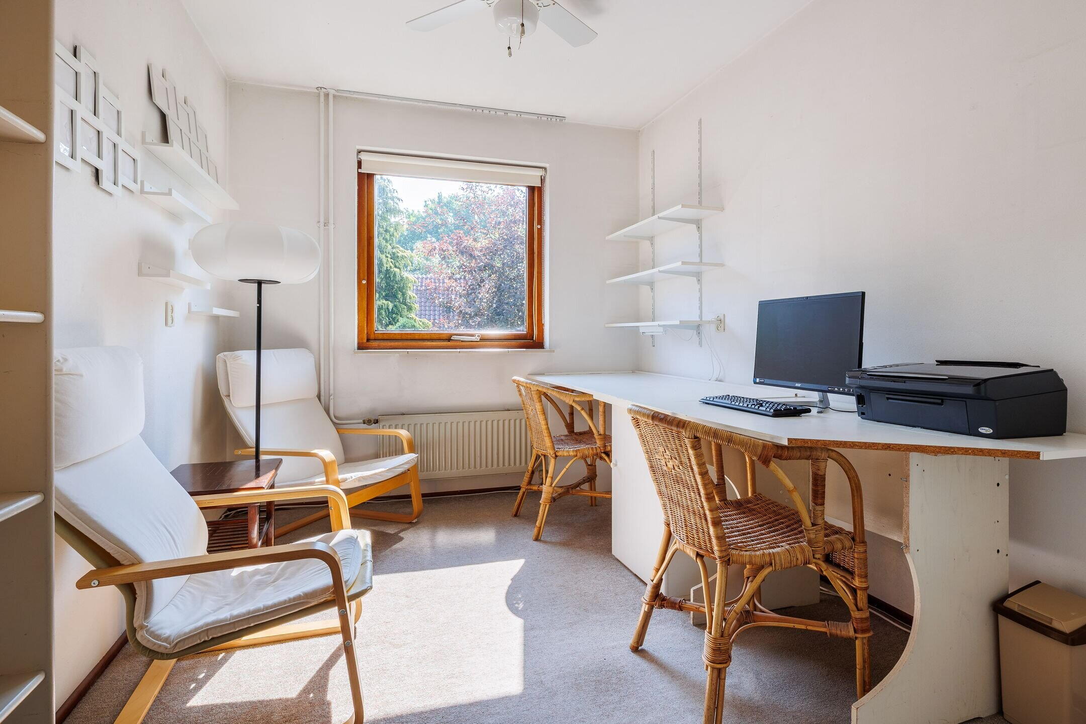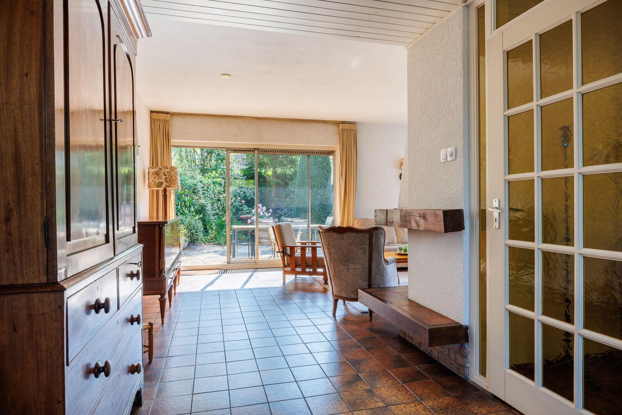 De achtertuin biedt veel privacy door de volgroeide bomen aan de achterzijde en is ingericht met meerdere beschutte zitjes. Dankzij de gunstige indeling zijn er zowel zonnige als schaduwrijke plekjes te vinden. De lange oprit naast de woning leidt naar een ruime garage met plek voor een auto én extra werkruimte, zoals een werkbank.